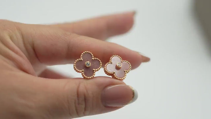 CZ Rhodonite 15mm Gold Clover Earrings Push Back Closure 1 Motif Luck Leaf