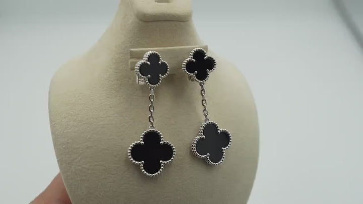 Add a touch of elegance with these Onyx 2 Motif Earrings. Crafted with 925 silver and 18k white gold plating, these push back earrings feature a unique 2-clover design. Say goodbye to boring earrings and change to a stylish, playful look!